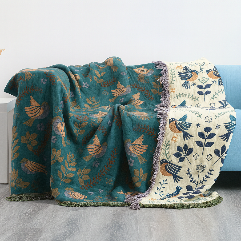 A patterned cotton throw with a soft, fluid drape and detailed floral motif, finished with tasselled edges and a contrasting reverse side. Made from woven cotton gauze, it has a breathable, lightly textured feel and is offered in multiple generous sizes suited to sofas, beds, and full coverage throws. It doesn’t really mind which side ends up facing up.